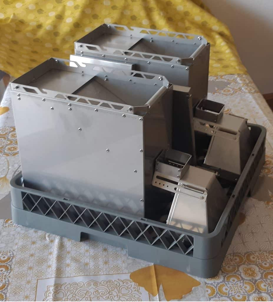 It is possible to put up to 2 dispensers, their lids and 2 distributors in a professional dishwasher (500x500x340mm) per wash cycle.